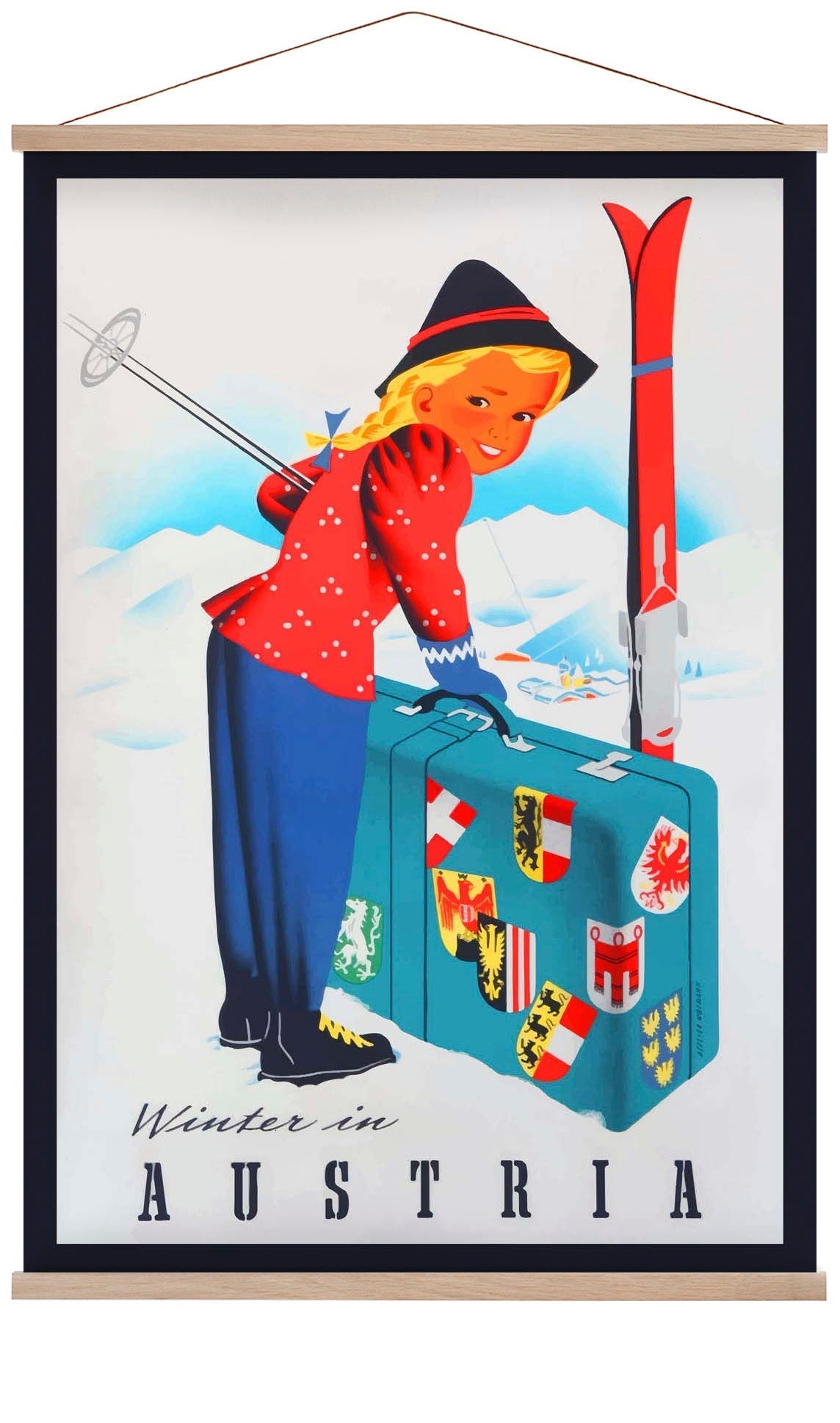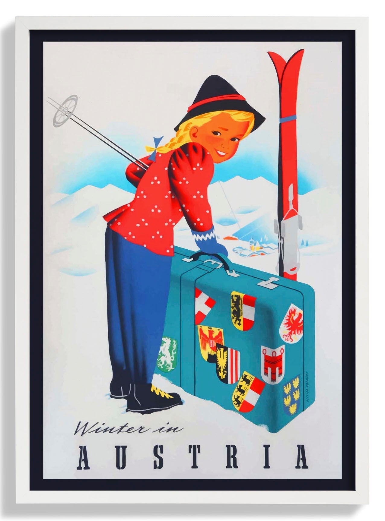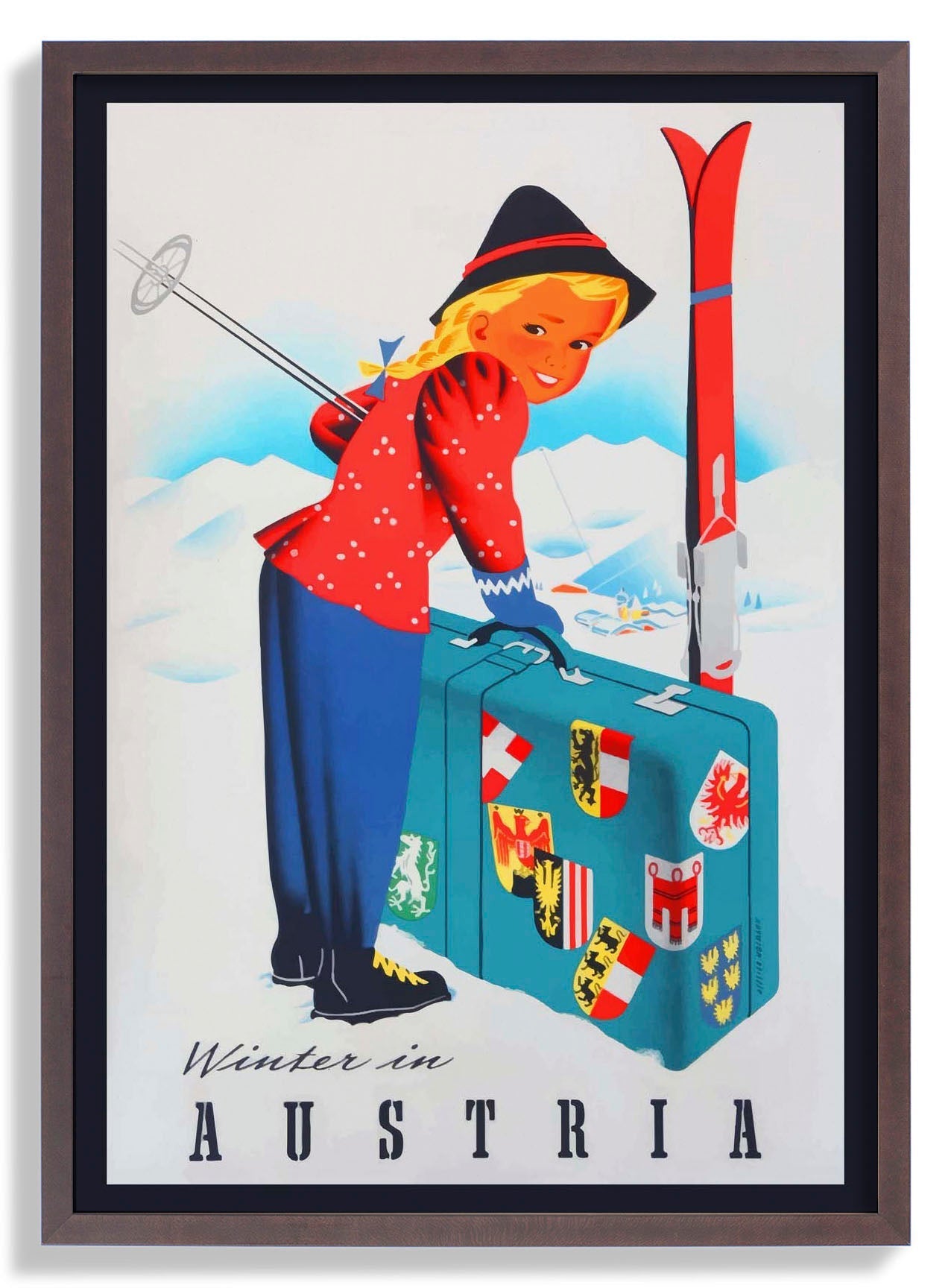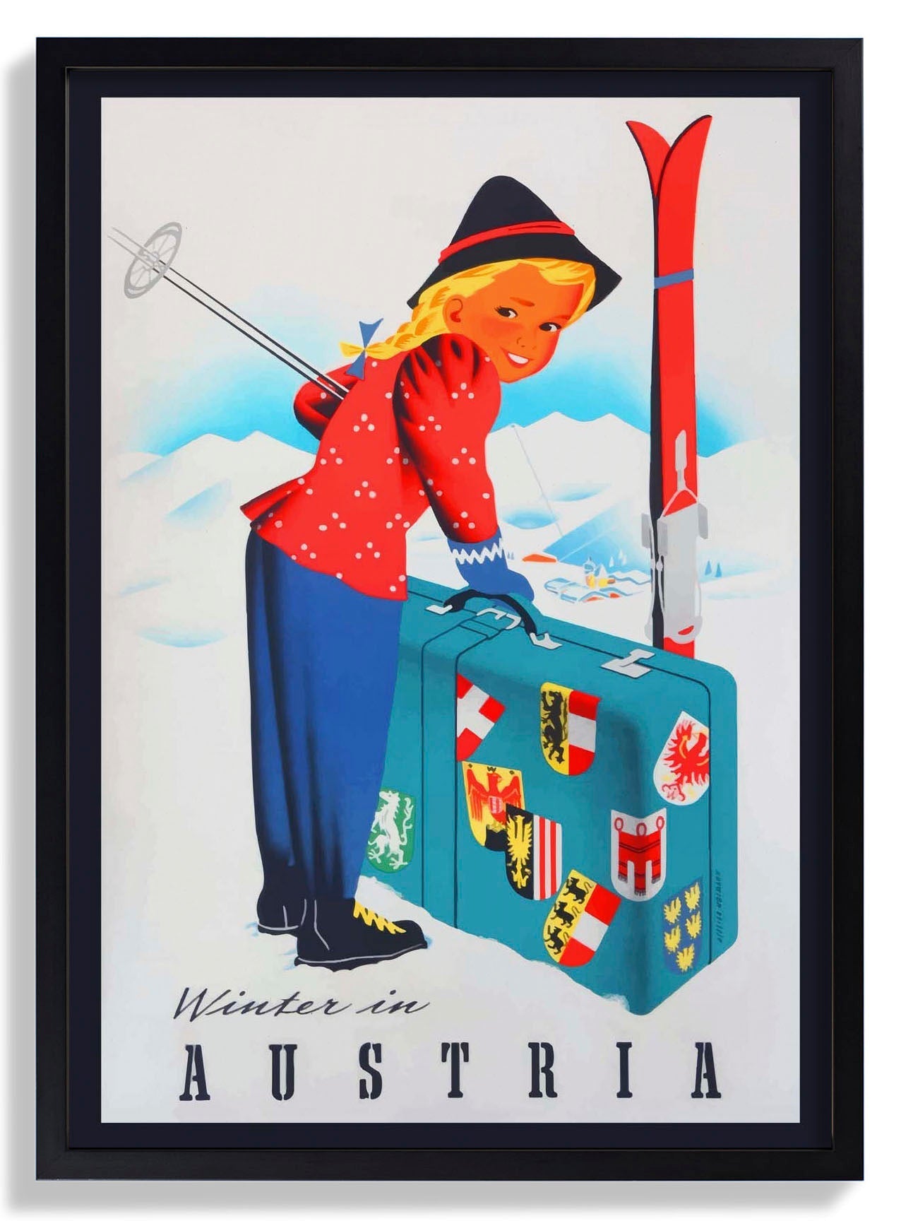 A winter travel poster with an image of the Austrian Alps and a girl ready for a ski trip.